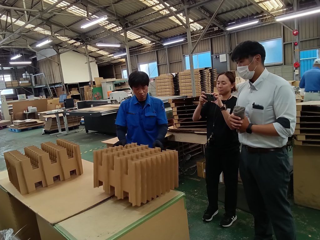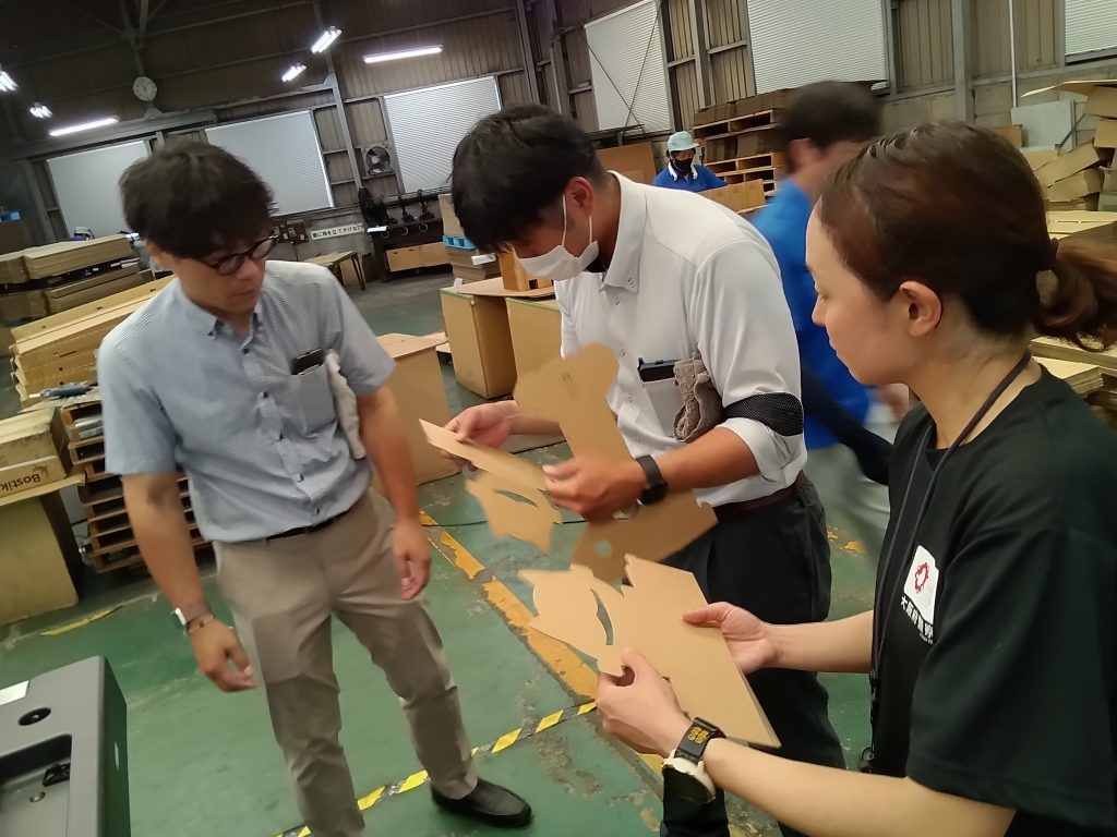 当日は、以前交通安全イベントの際にご協力させていただいた「段ボール写真立て」の製造方法や、他主力商品の製造の様子等を見学していただきました。